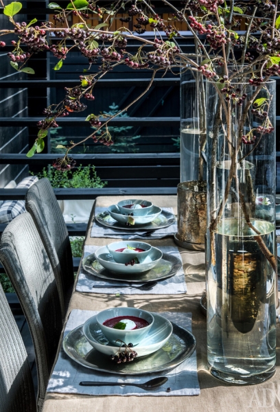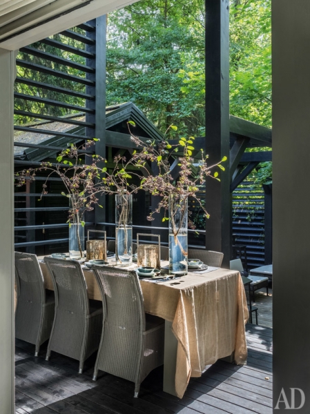 Обеденная зона на террасе дома. Стол сделан на заказ по эскизам дизайнеров; стулья, Vincent Sheppard.