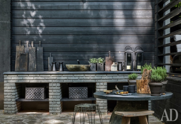 Открытая терраса, переходящая в зону летней кухни. Круглый каменный стол, играющий роль столика для шампанского, Leform.