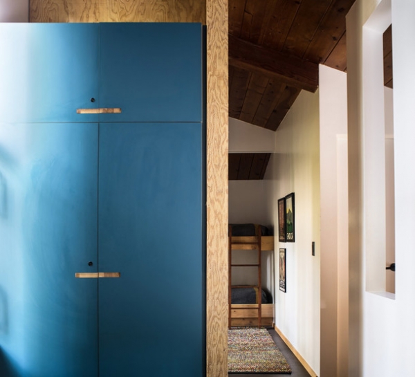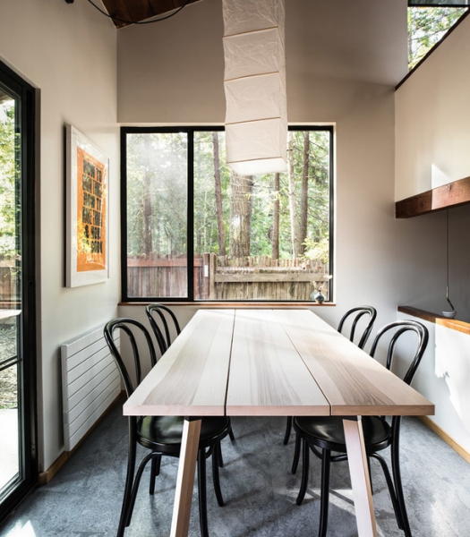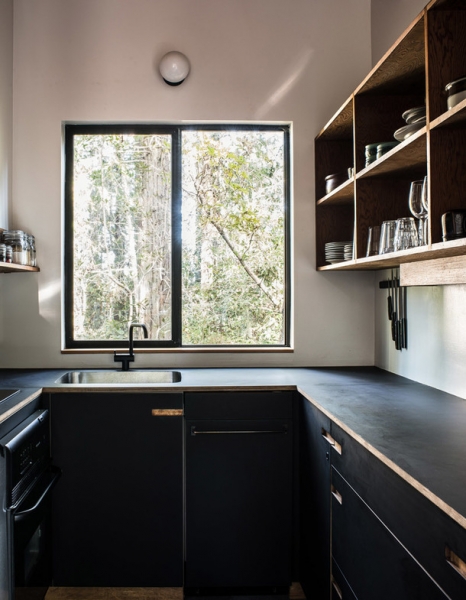 Архитекторы старались сохранить оригинальную конструкцию и материалы, привнося в новый проект только элементы, необходимые для комфорта жильцов. На кухне, например, нижние шкафы заменили более функциональным гарнитуром, изготовленным из березовой фанеры и покрытым матовым черным ламинатом. Туда же поместили кухонные приборы, включая посудомоечную машину, плиту и вытяжку.