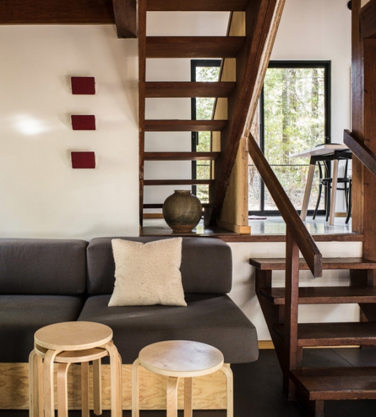 В гостиной архитекторы установили встроенный диван, в котором находятся дополнительная система хранения и выдвижная кровать размера queen-size, поэтому в маленьком на первый взгляд домике с легкостью поместятся шесть человек.