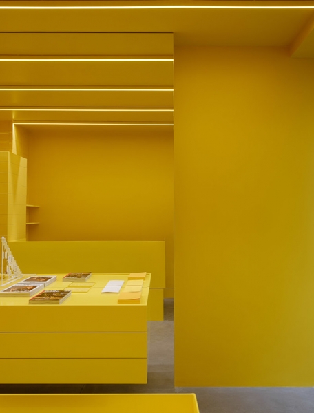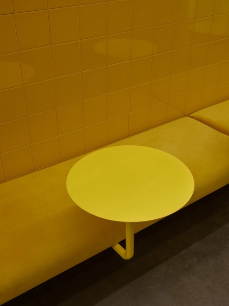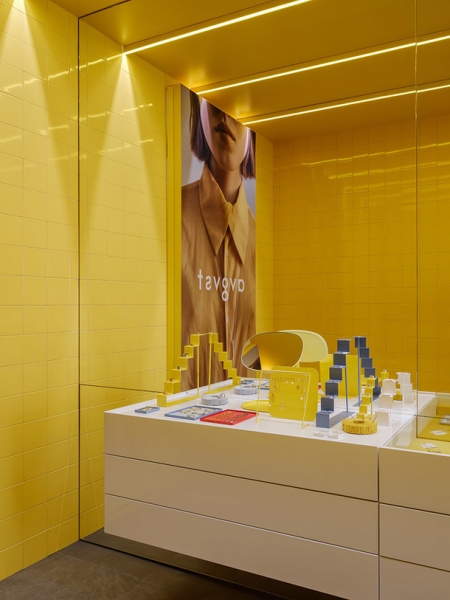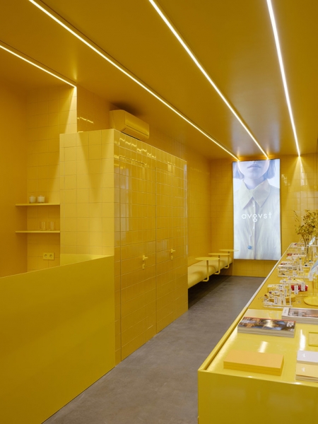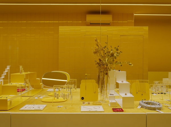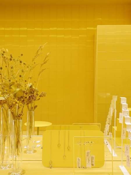 Цвет как главный герой всех проектов Crosby Studios и на этот раз сыграл свою роль. Ярко-желтые стены, выложенные плиткой, металл и бетон — вот все составляющие пространства ювелирного магазина. Максимально просто, но при этом взгляд задерживается на каждой поверхности. Пол достался дизайнерам от предыдущих арендаторов, и с ним ничего делать не стали — он идеально вписался в новый интерьер.