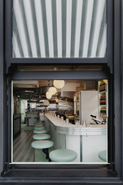 Полосы действительно присутствуют во всех элементах дизайна ресторана. Навес повторяет аутентичный зелено-белый козырек гастронома, а пол в ресторане выложен полосатой плиткой, продолжающей узор.