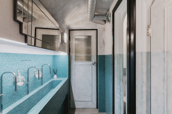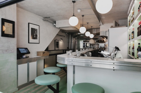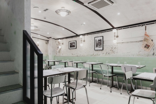 Барные стулья, как и сами диванчики на нижнем этаже, покрыты кожей мятного цвета, а плитка такого же оттенка украшает стены и заменяет спинку сидушек. Белые открытые кирпичные стены и сводчатый потолок на нижнем этаже создают атмосферу домашней итальянской траттории, а столешницы, сделанные из каррарского мрамора, лишь дополняют это ощущение.