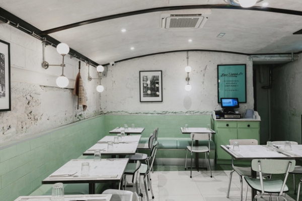 На улице гостей встречает пол, выложенный мелкой мозаикой с названием кафе. “Мы хотели добавить фасаду континентальные штрихи, и, бесспорно, должен был появиться мозаичный пол, чтобы приветствовать приходящих гостей. Не так много фасадов в Сохо выложены плиткой, поэтому это было ключом к нестандартному дизайну”, — рассказали в бюро.