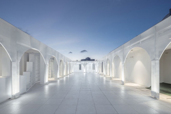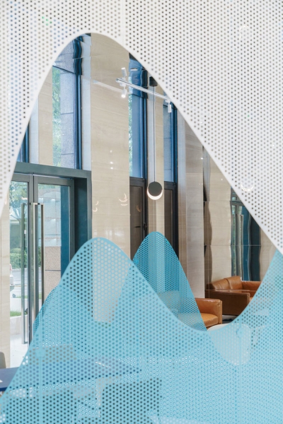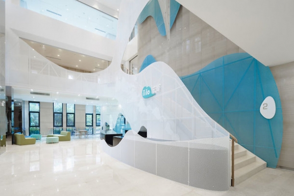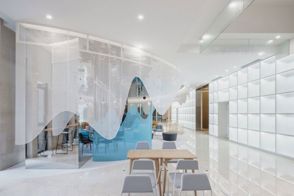 Все пространства выдержаны в едином стиле — белоснежные и голубые облака, словно вуаль, окутывают помещения. Чтобы добиться такого ощущения воздушности и легкости, архитекторы использовали перфорированные алюминиевые пластины.
