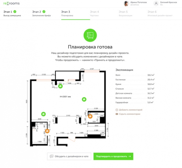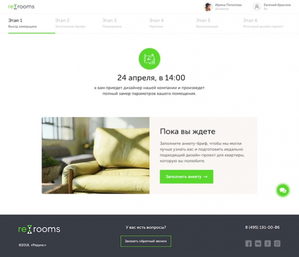 При этом работа сервиса строится не на невидимых роботизированных процессах. В ReRooms работает целая команда профессиональных дизайнеров — просто их работа организована таким образом, что нет вынужденного простоя, а значит, эффективность увеличивается в несколько раз. В остальном же схема привычная: клиент встречается с дизайнером-замерщиком на объекте, делаются замеры и выясняются потребности и предпочтения клиента. Далее вся полученная информация в виде чертежей и анкеты передается ведущему дизайнеру, который уточняет оставшиеся вопросы с клиентом, утверждает бриф и формирует концепцию проекта с базовыми планировками. Затем к работе подключаются чертежник и визуализатор (кстати, в ходе работы над проектом клиент может бесплатно внести по одной группе правок в чертежи и визуализации). Важно заметить, что весь рабочий процесс абсолютно интерактивен — он ведется в информационной системе сервиса ReRooms. Клиент имеет возможность следить за всеми этапами и активно участвовать в них, принимая или не принимая результаты работ, внося правки, комментарии.
