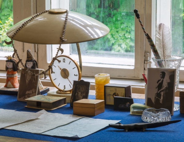На письменном столе писателя — портрет Анны Ахматовой, два крокодила — один мраморный, другой из черного дерева, камень, который привез из Новой Зеландии исследователь Африки Андрей Капица, и еще ворох памятных мелочей.