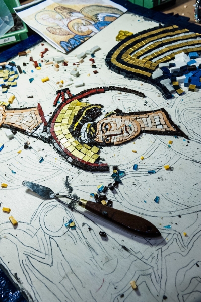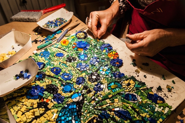 Традиционное венецианское производство стеклянной мозаики smalto. Стеклодувные печи, старинные технологии — все по-настоящему. Можно позвонить и попроситься на экскурсию, вас с удовольствием проведут, покажут то, как создавалась и создается знаменитая мозаика (именно она украшает фасады Сан-Марко, например), но главное — там можно увидеть их знаменитую библиотеку цветов, всего более 3000 вариантов. Только сусального золота, кажется, восемь видов.