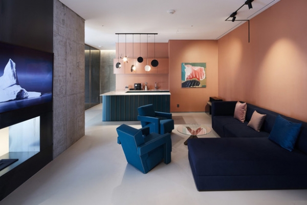 Необработанные бетонные стены в сочетании с розовыми полами создают в лофте творческую атмосферу. Бархатные шторы, сотканные вручную ковры из Кении и геометрическая мебель придают интерьеру необходимый для отеля статус и комфорт.