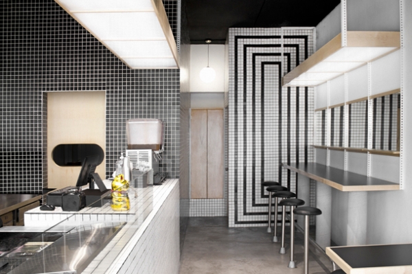 “Мы хотели использовать чистые материалы и при этом создать комфортное и приветливое место, где люди смогут насладиться готовой здоровой едой быстро и просто. Чтобы этого достичь, мы постарались сбалансировать использование белой и черной плитки с древесной фанерой в кленовых оттенках”, —рассказали авторы проекта.