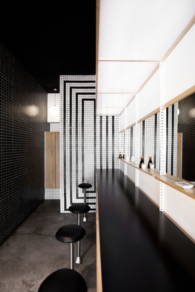 Кафе действительно напоминает огромную миску риса: миниатюрная черно-белая плитка, бумажная упаковка для суши, меню и даже буква “O” в названии заведения — всё здесь крутится вокруг рисовой крупинки и напоминает ее. Практически монохромный черно-белый интерьер сочетается с минималистичным дизайном и характерными, разработанными специально для кафе элементами айдентики и графики.