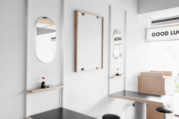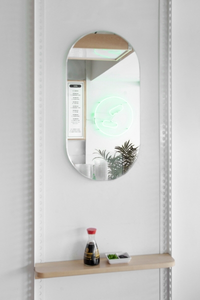 "Функциональные элементы, такие как длинная входная зона и передний фасад, способствуют проникновению в помещение большого количества естественного света. Также мы установили зеркальные дисплеи с деревянными рамками и неоновое освещение, чтобы акцентировать внимание на концепции кафе и некоторых блюдах", — прокомментировали архитекторы.