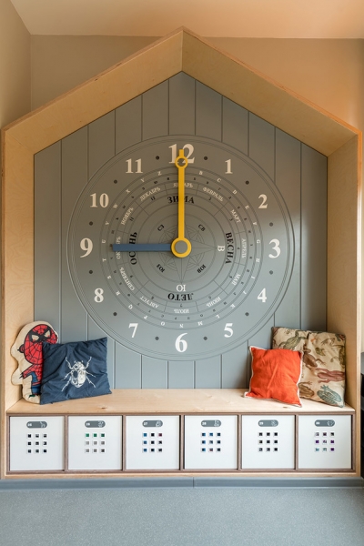 В другом конце комнаты на месте практически бесполезного встроенного шкафа, появились ящики, где ученики могут оставлять свои вещи, а над ними полки, которые использует учитель. Рядом дизайнеры сконструировали зону для отдыха и развлечения детей, похожую на домик. "Первоклашки совсем недавно были в детском саду, где все совсем по-другому. Нам хотелось, чтобы они чувствовали себя здесь как дома, – объясняют они свою задумку. – По часам, которые мы придумали, можно многое объяснить и показать взаимосвязь явлений. На циферблат нанесены цифры, буквы русского и английского алфавитов, градусы, стороны света и времена года".То время, которое Чебурашкины планировали потратить на проектирование парт и стульев, ушло на ремонт санузлов, поэтому парты здесь стоят обычные, а крутящиеся стулья на колесиках купили в ИКЕА. Их выкрасили в разные оттенки желтого и расставили рядами: от бледного к более насыщенному.