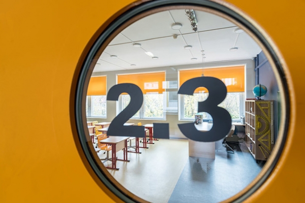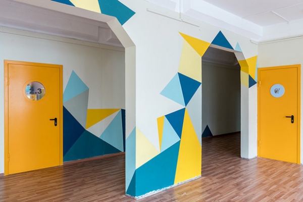 В коридоре и зоне отдыха тоже сделали ремонт: выкрасили стены в яркие цвета и установили во все младшие классы металлические противопожарные двери с круглыми окошками. Так создается ощущение, что холл это не замкнутое пространство и даже при закрытых дверях в него попадает дневной свет.