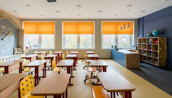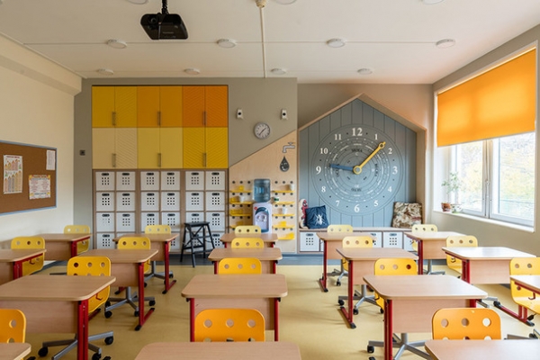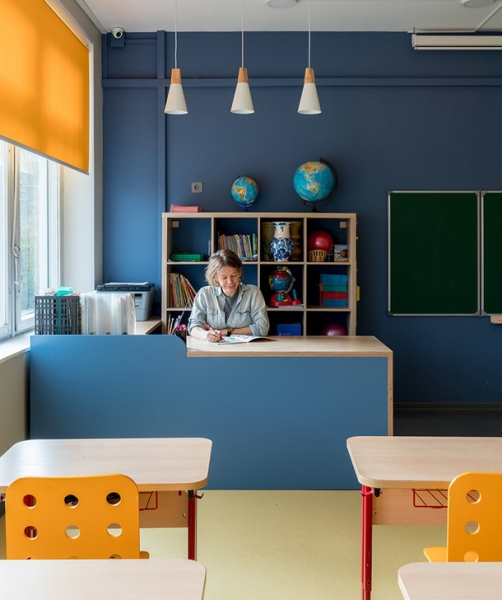 "Это упрощает ориентацию детей в классе, – объясняет Кирилл, – и радует глаз учителя". Вообще желтый в интерьере появился не случайно: в Москве не хватает солнечного света, поэтому это своего рода компенсация. Дизайнеры также полностью переделали освещение. По их мнению, от него зависит не только то, как будет выглядеть класс: как операционная или уютная комната, – но и настроение учащихся, а над учительским столом повесили дополнительные светильники.