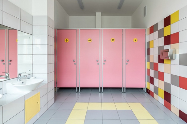 Туалет для девочек. Здесь дверцы выкрашены в розовый, а у мальчиков – в голубой, чтобы детям было проще понять, куда они зашли.