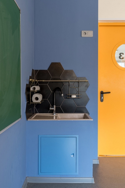 "Мы решили, что по функциональности она ближе к кухонной мойке, потому что здесь не только смачивают губки и тряпки, но и моют детские чашки, – объясняет Кирилл. Неэстетичные коммуникации убрали в короб, выкрашенный в цвет стен, крохотный "кухонный фартук" сделали из черной плитки и установили такого же цвета смеситель, чтобы он с ней сливался. Так дизайнеры дали понять, что главный элемент в классе — это доска и ничто не должно отвлекать внимание детей от нее.