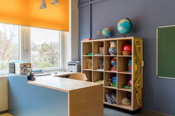 В самом классе основные преобразования случились в самой важной зоне – у фронтальной стены с доской. "Комната напоминала филиал Политехнического музея! Здесь были меловая доска, интерактивная и магнитно-маркерная, а еще телевизор, видеоплеер, DVD-проигрыватель, проектор и экран. Совершенно не понятно, какой носитель важнее и куда надо смотреть", – говорит Кирилл. Проанализировав, что необходимо учителю под рукой, а что можно убрать подальше, дизайнеры навели порядок: рядом со столом учителя поставили стеллаж, спроектировали новый письменный стол с невысокой перегородкой, скрывающей часть столешницы от детских глаз, а раковину для мытья губок сделали визуально не очень незаметной и удобной.
