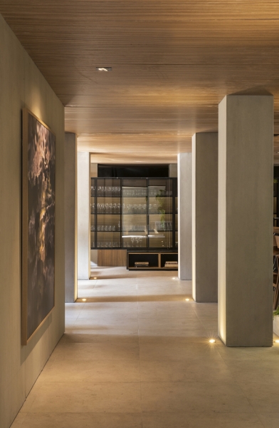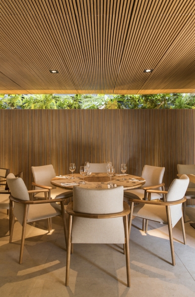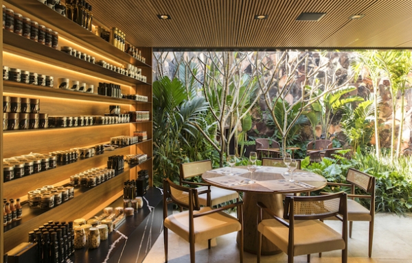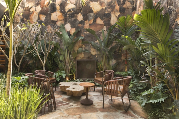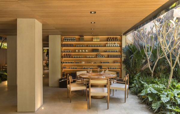 Натуральные материалы (камень, дерево и бетон), из которых выполнены мебель и отделка ресторана, органично сочетаются с зеленью. Объединенные уличная и внутренняя зоны ресторана делают интерьер светлым и просторным, создавая ощущение, что вы находитесь в тропическом лесу, даже если вас укрывает крыша, а внутри совсем не жарко.