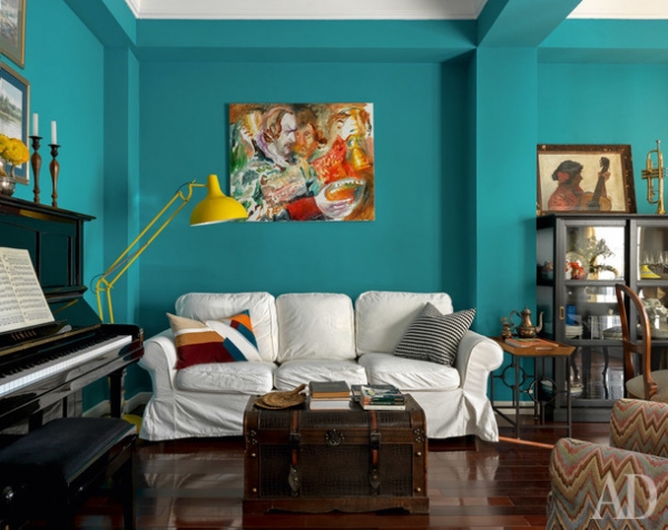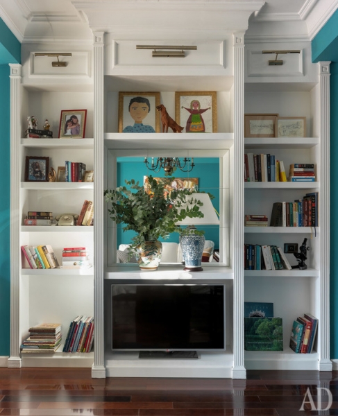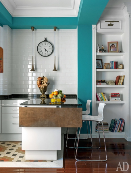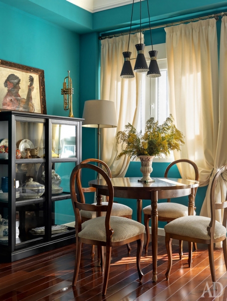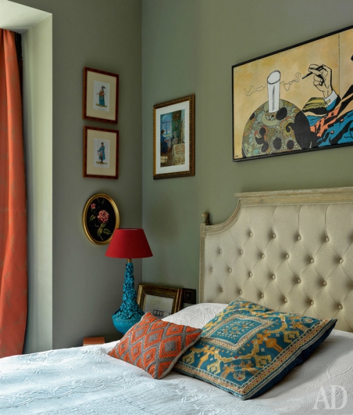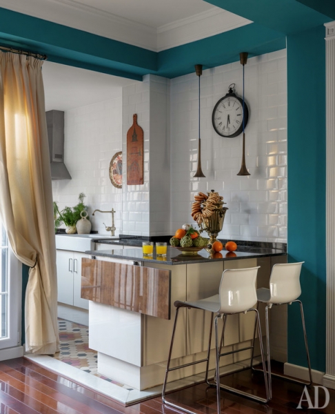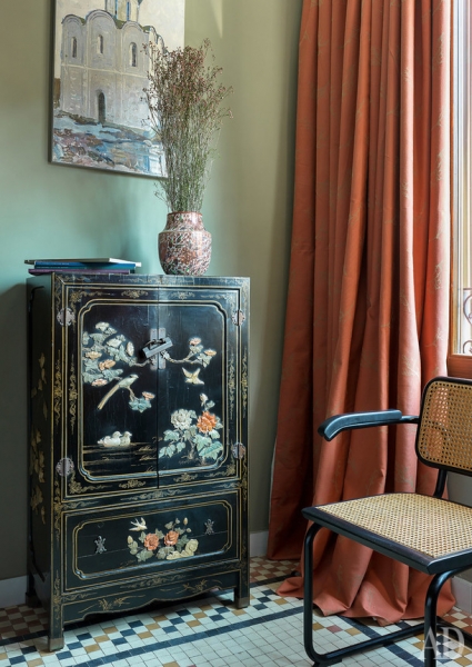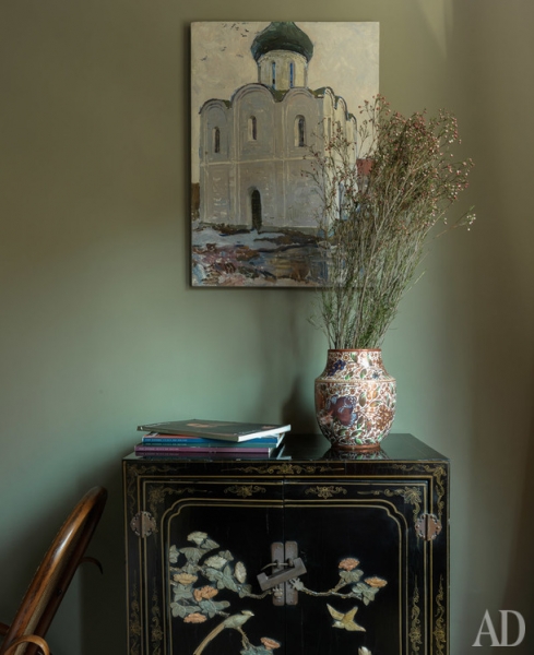 Россия представлена в интерьере аксессуарами и искусством. До переезда в Испанию Ольга с мужем несколько лет прожили в Калуге, где начали собирать работы местного художника Иосифа Павлишака, которые взяли с собой в Валенсию. На кухне появился самовар, а для стен гостиной выбрали сине-зеленый цвет, характерный для русских усадеб. Интерьер наполняли без всякого плана, но, как говорит Ольга, “если предметы нравятся нам каждый по отдельности, им тоже придется подружиться”, так что все сложилось в цельную картинку.