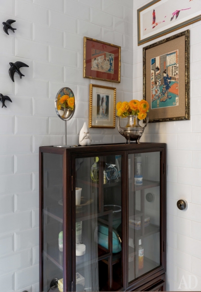 Коллекция японских гравюр укие-э, ласточки, вылетающие в окно, валенскииский магазин Simple.» title=»Фрагмент ваннои комнаты. Китаискии шкаф из антикварного магазина из Андалусии. Серебряныи французскии кофеиник используется как ваза.