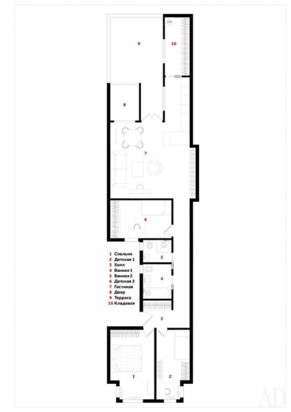 Ольга называет эту квартиру “сосиской” – в плане она представляет собой длинный-предлинный прямоугольник с окнами в торцах и световым колодцем посередине. Чтобы приспособить пространство к нуждам семьи с тремя детьми, пришлось начать с перепланировки – кухня переехала поближе к гостиной, а на ее месте появилась еще одна детская.