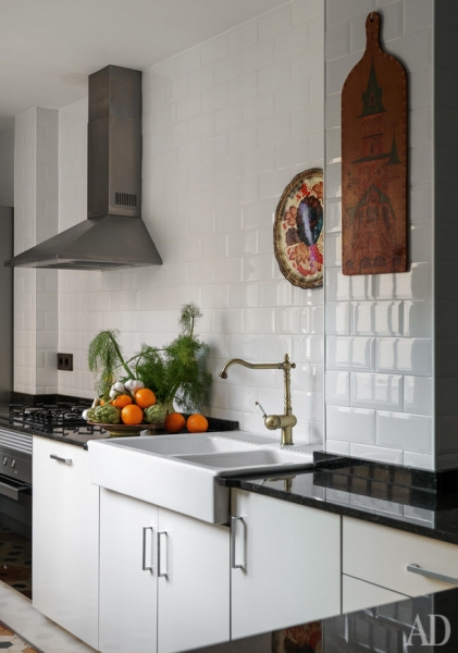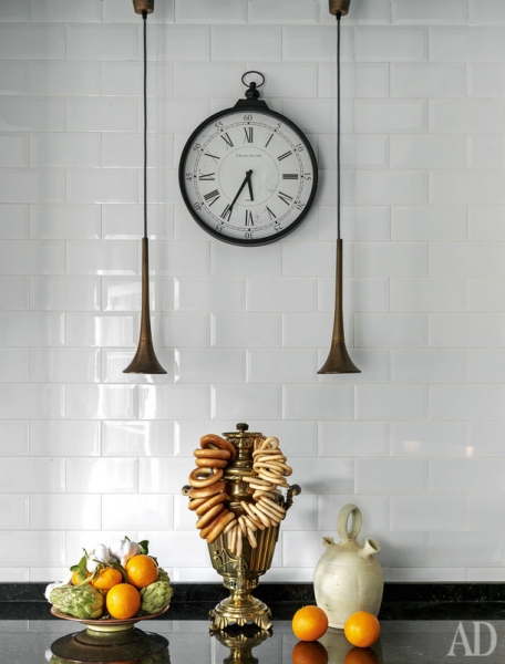 Фрагмент кухни. Столешница кухонного гарнитура сделана из мрамора. С российским самоваром соседствует сосуд ботихо, средиземноморский “холодильник”. Благодаря пористой поверхности вода в нем не нагревается, а остужается.