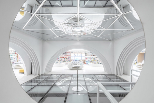 В центре зоны чтения находится своего рода пантеон, где в раскрытом виде демонстрируется выбранная магазином книга месяца. Под ним — стеклянный пол, имитирующий поверхность воды, под которым просматриваются нижние этажи и “невидимая академия”, как ее назвали авторы проекта, — пространство для чтения и проведения мини-конференций. Вместе они образуют центр и оазис спокойствия книжного магазина Zhongshu.