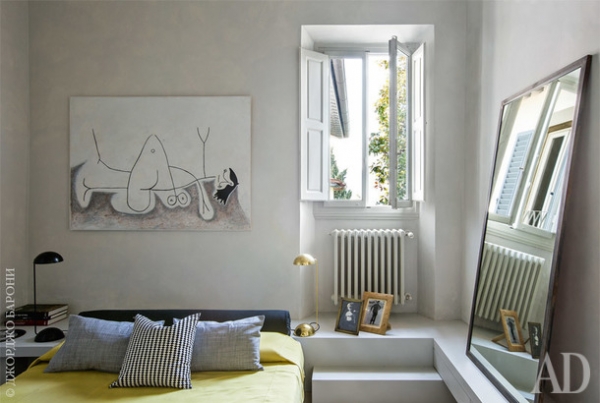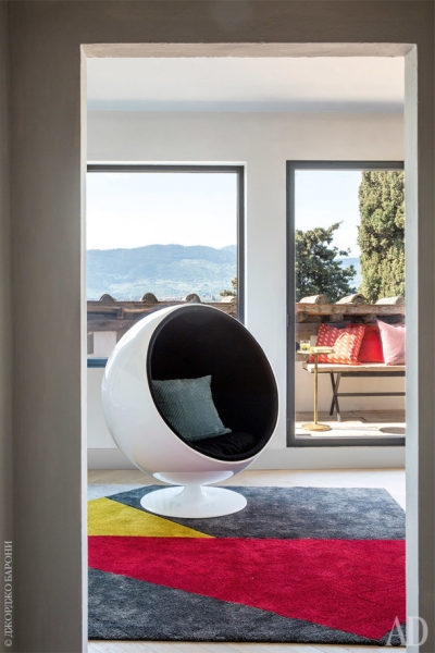 Разглядывая винтажную мебель, современное искусство и яркие дизайнерские ковры, даже не предполагаешь, что это обстановка итальянской виллы XVI века. Однако оправдание для такого веселья есть: постройка, где находится эта небольшая квартира, появилась на территории поместья Le Pozzarelle одной из последних, поэтому может считаться самой молодой.