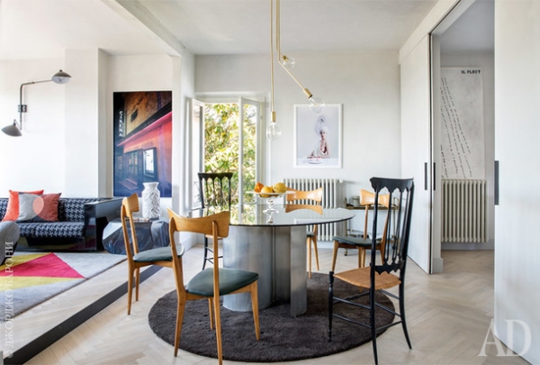 Зона столовой. Обеденный стол 1970-х годов; стулья по дизайну Ико Паризи 1960-х годов; между ними два стула Chiavari начала XX века; ковер по дизайну ABarchitects; автор фотографии на стене — Вирджиния Паники. Справа находится кухня, которая отделяется раздвижными дверями.