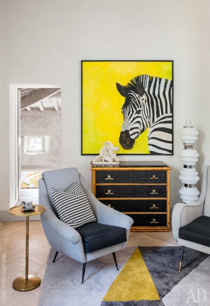 Игровая. Кресла 1950-х годов обтянуты современными тканями; комод из бамбука 1970-х годов; на комоде мраморная скульптура XIX века; торшер из муранского стекла; картина Вирджинии Паники.