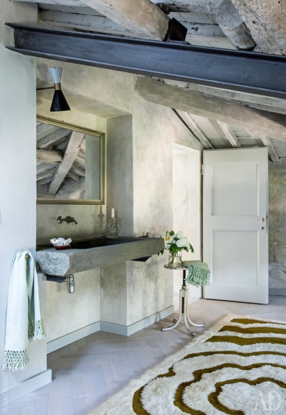 В обстановке все довольно просто: крашеные стены, паркет “елочкой”, винтажная мебель, среди которой встречаются иконы дизайна, и немного картин. Только небольшая мраморная скульптура XIX века и стулья Chiavari начала XX века отсылают нас к более далекой истории. Хозяйская ванная комната стала самым богемным помещением в доме. Здесь дизайнеры оставили на виду балки, стенам придали фактуру бетона, а в качестве раковины использовали каменное корыто, в котором раньше стирали одежду. А вот гостевой ванной досталось большое окно в сад.