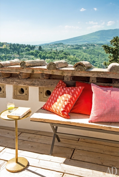 Терраса на крыше виллы. Отсюда открывается вид на городок Фьезоле. Старые доски кровли служат полом; лавка сделана по дизайну ABarchitects; журнальный столик 1950-х годов.