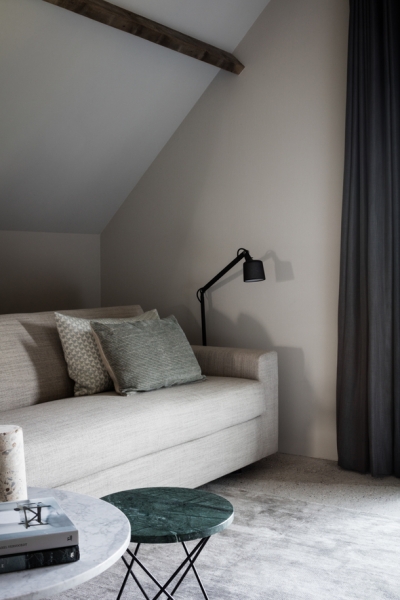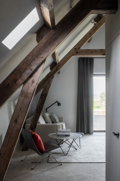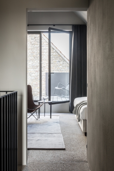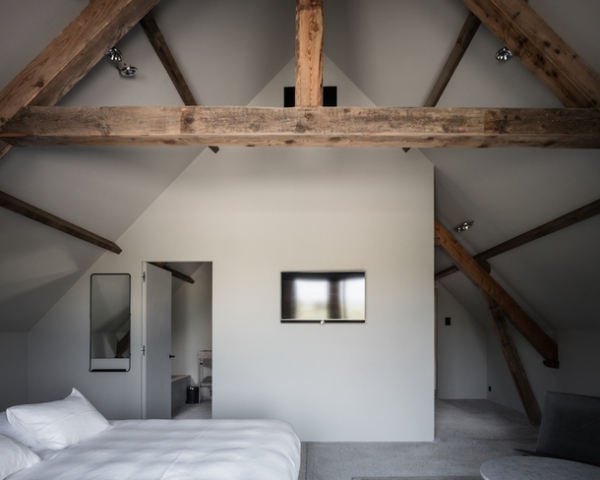 Главным пространством нового отеля стал исторический амбар, площадь которого архитекторы существенно увеличили, пристроив дополнительное здание из дерева. Новая остроконечная крыша продолжает линию оригинального кирпичного здания и гармонично объединяет две части постройки. Огромные окна выходят на поле, усеянное историческими постройками времен Первой мировой войны, где сейчас обитают фермерские куры и овцы.