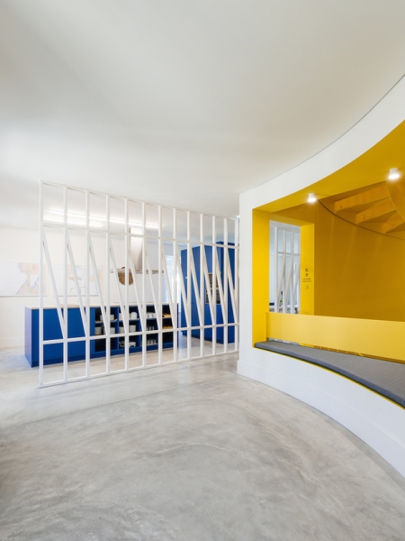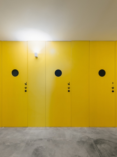 Цветовое решение подсказала функция здания — оно предназначено для отдыха, хотя и коллективного. Желтая лестница излучает свет и позитив, синие стеллажи в столовой напоминают о море, белые стены и пол дарят прохладу даже в самый жаркий день.