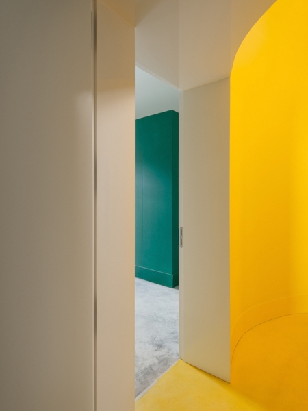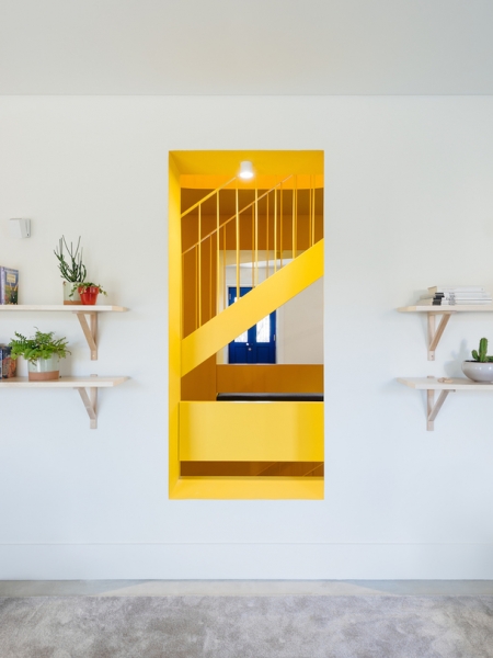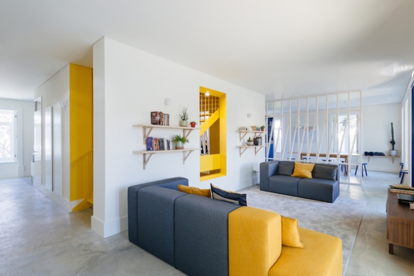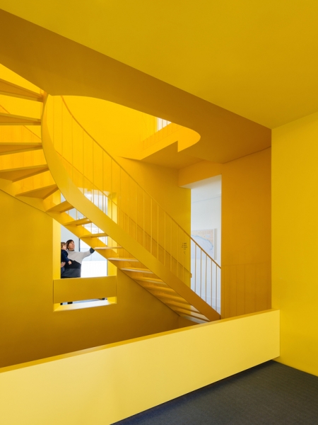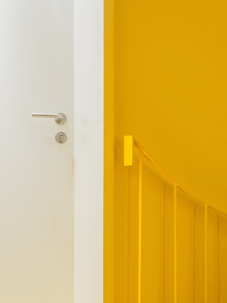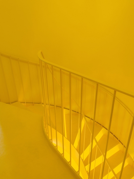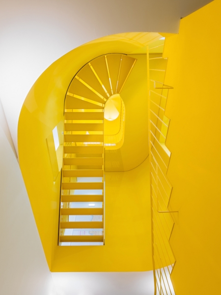 В плане дом разделен на девять модулей. В центральном находится лестница, соединяющая три этажа и радующая глаз своими плавными формами и веселым желтым цветом.