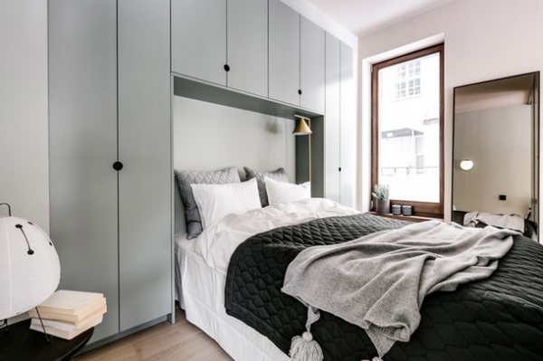 В спальню можно попасть из гостиной. Интересно, что дизайнеры решили "зажать" кровать между дверью и стеной. Таким образом, чтобы подойти к кровати с какой-либо стороны, придется зайти либо в левую, либо в правую скользящую дверь спальни. Прямо над кроватью расположились удобные шкафчики из ясеневого шпона, куда можно убрать мелкие вещи, которые часто бывают раскиданы по всей спальне.
