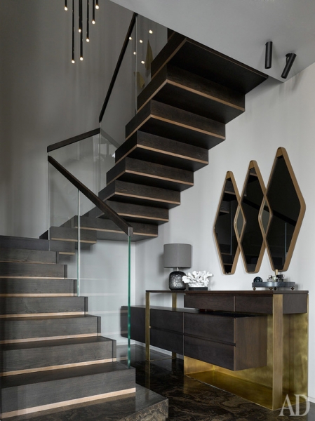 Прихожая. Лестница и консоль по проекту DWG Interiors (производство — Arte+partners, металлические элементы — De Castelli, лестница — Carpenteria Brotto). Зеркало, Arketipo; люстра, Vibia; лампа, GUAX; аксессуары, Global views, Object de Curiosite.