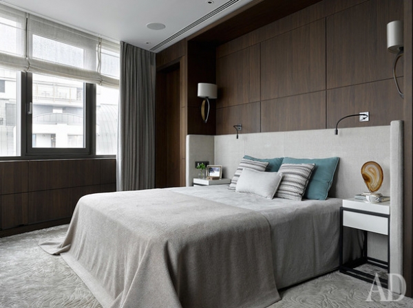 Спальня. Буазери по проекту DCG Interiors (производство — Frezza Arredamenti ). Кровать, Nilson Beds в ткани, Glant. Прикроватные тумбы, Nilson Beds; ковер по диазйну Микаэлы шлейпен, Koverburo; кресло, Petite Friture; бра, CTO lighting; торшер, Estiluz. Текстиль, de Le Cuona, Holland & Sherry. Покрывало, Loro Piana.