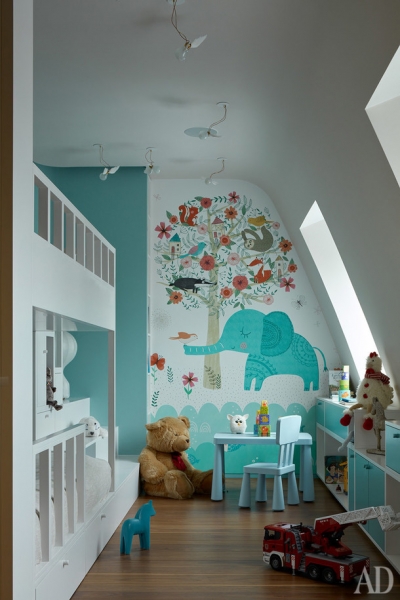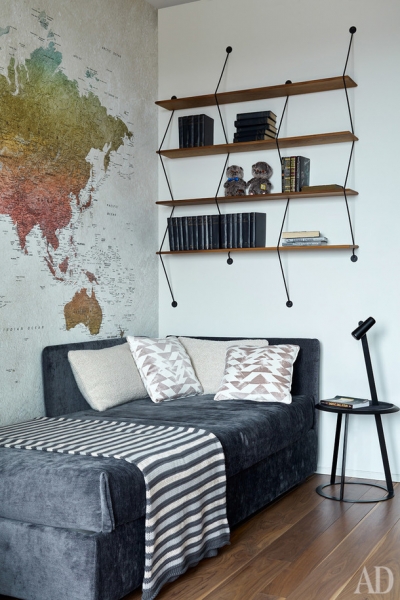 Фрагмент одной из детских. Кровать и система хранения по проекту DWG Interiors (производство — столярная мастерская «Ордер»). Светильники, Ingo Maurer. Торшер, Flos. Обои по индивидуальному эскизу.
