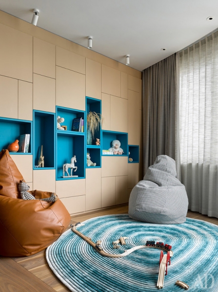 Детская игровая при гостиной. Система хранения по проекту DWG Interiors (производство — Frezza Arredamenti (Flat interiors/ салон Флэт-интерьеры)); кресла-пуфы, Zanotta; ковер по диазйун Микаэлы Шлейпен, Koverburo; текстиль, Mark Alexander.