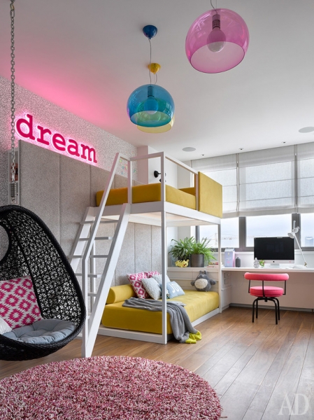Одна из детских. Кровать и рабочее место по проекту DWG Interiors (производство — столярная мастерская «Ордер»); рабочее кресло, Cassina; подвесное кресло, Varaschin; светильники, Kartell; бра и настольная лампа,Atelier Areti. Текстиль, Jim Thompson, Scion, Manuel Canovas.