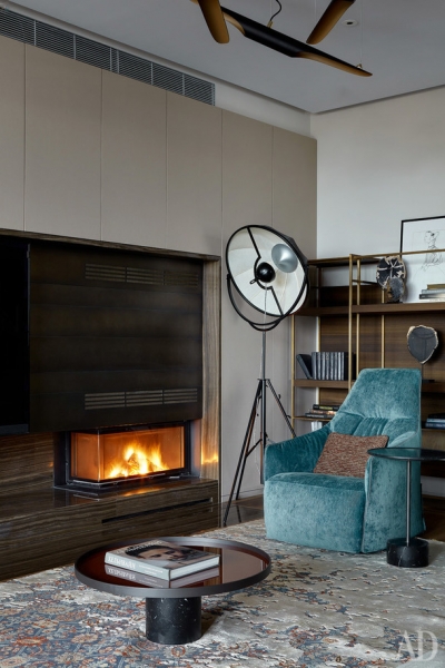 Центральный элемент гостиной — это камин. В пентхаусе был предусмотрен дымоход, поэтому архитекторы воспользовались такой удаче и сделали настоящий дровяной камин.
