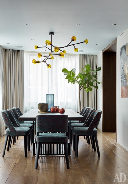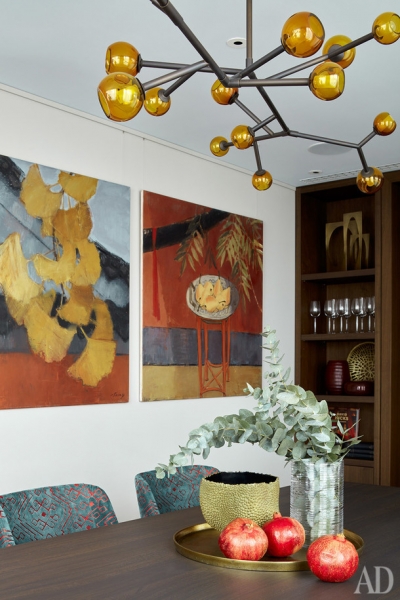 Картины работы Татьяна Ян. Аксессуары, Alexander Lamont, Global views, Arteriors, Guax, Object de Curiosite, Crate & barrel.» title=»Столовая. Обеденный стол по дизайну Патриции Уркиолы, Molteni & C. Стулья, Minotti в ткани, Sacho. Люстра, Pouenat. Текстиль, Jim Thompson, Romo