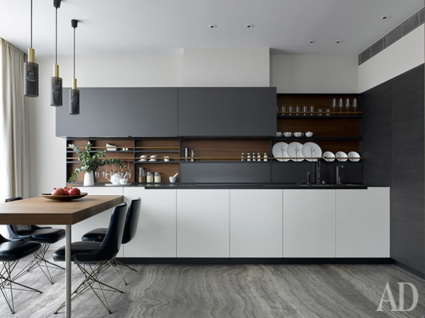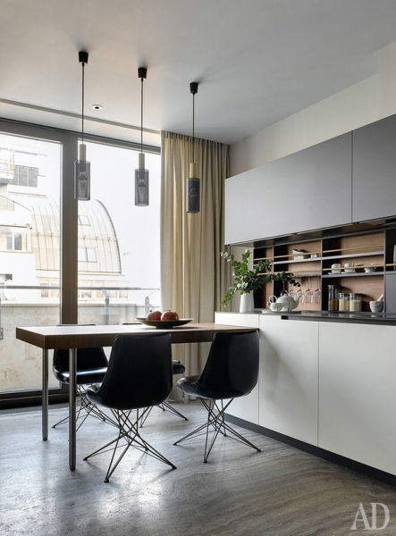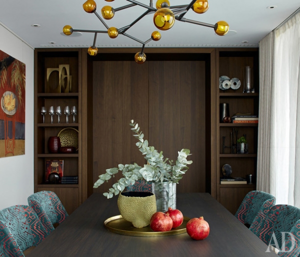 Картины работы Татьяна Ян. Аксессуары, Alexander Lamont, Global views, Arteriors, Guax, Object de Curiosite, Crate & barrel.» title=»Столовая. Система раздвижных дверей, система хранения по проекту DWG Interiors (производство — Frezza Arredamenti (Flat interiors / салон Флэт-интерьеры)). Обеденный стол по дизайну Патриции Уркиолы, Molteni & C. Стулья, Minotti в ткани, Sacho. Люстра, Pouenat. Текстиль, Jim Thompson, Romo
