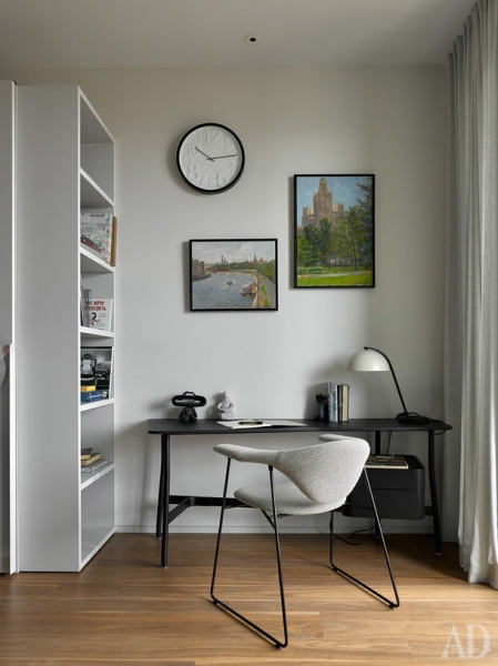 Одна из детских. Кровать, Orizzonti; стеллаж, La Сhance; столик, Horn; шкаф, Pianca; рабочий стол, Cassina; рабочее кресло, Gubi; настольная лампа, Hay.
