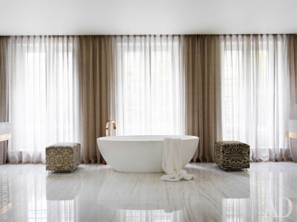 Хозяйская ванная комната. Ванна из цельного мрамора, Bianco Dolomiiti. Пуфы по дизайну Наталии Мияр обтянуты тканью Fortuny.