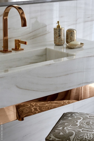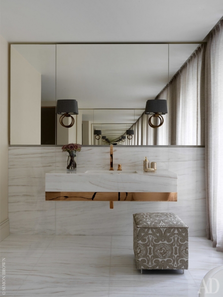 Хозяйская ванная комната не уступает по площади спальне. Здесь у окна стоит ванна, вырезанная из цельного мрамора. В этом помещении на смену уюту вновь приходит элегантность, однако стерильность и "холодность" камня, использованного для отделки, разбавлена медным блеском смесителей и консоли под раковиной.