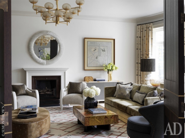 Основной тон интерьера задается сразу при входе: модный, элегантный и сдержанный. Стены холла выкрашены в сложный серо-зеленый оттенок Farrow & Ball, на его фоне эффектно выделяется лаконичная банкетка по дизайну Натальи, обтянутая тканью Hermes. Отсюда гости попадают в парадную гостиную, в которой появляются более теплые тона: золотые, бежевые и бронзовые. Внимание привлекает висящее над камином зеркало, рама которого сделана из фрагментов муранского стекла, больше похожих на перья.
