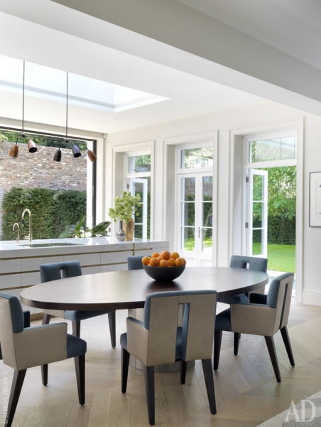 Небольшая семейная столовая, совмещенная с кухней. Стулья обтянуты тканью по дизайну Rose Tarlow.